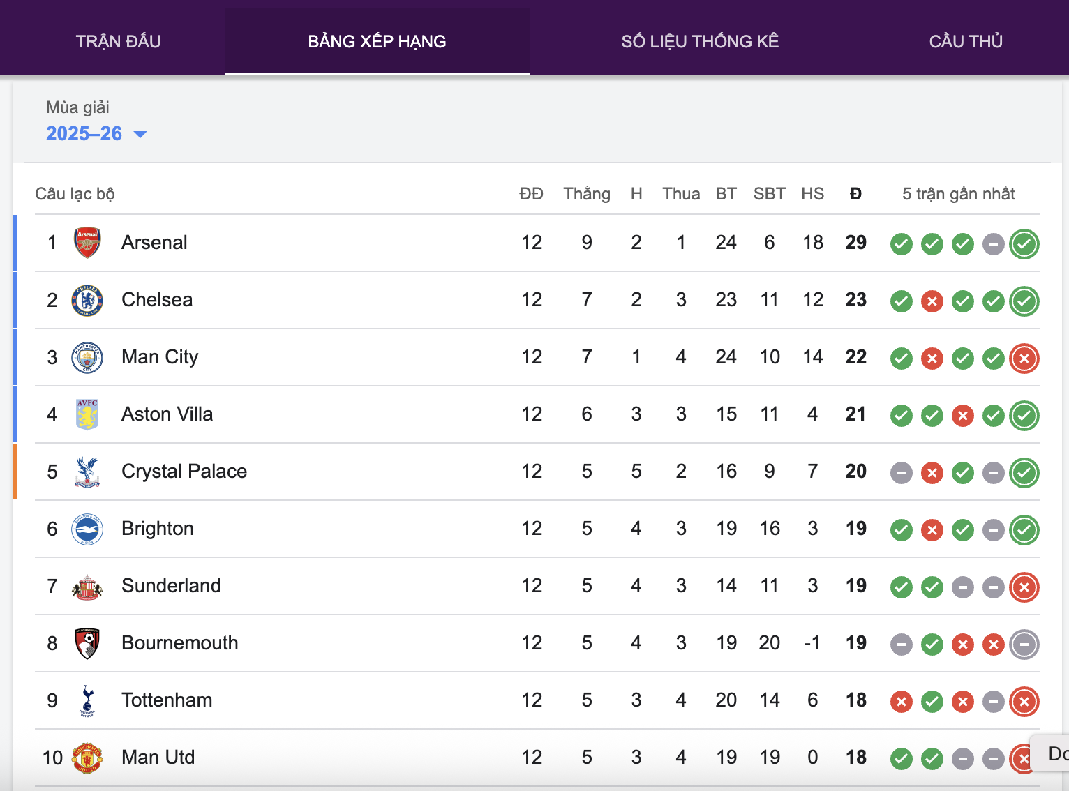 - Phân tích: Khả năng kiểm soát trận đấu và chuyển đổi trạng thái (transition) cực nhanh giúp Arsenal rất nguy hiểm khi thi đấu xa nhà. Họ đã đánh bại những đối thủ khó chịu như Newcastle, Aston Villa và Tottenham (dù trận thắng Tottenham là sân nhà, nhưng họ cũng thắng ở các trận derby khác).